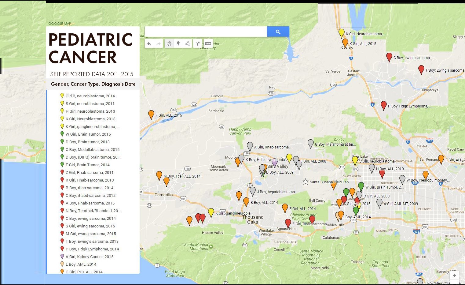 Parents near the Santa Susana Field Lab created a google map of pediatric cancers* to see if there was a correlation between our children’s cancers and the environment. We soon discovered we were all within miles of a toxic and radioactive site that had never been properly cleaned up.